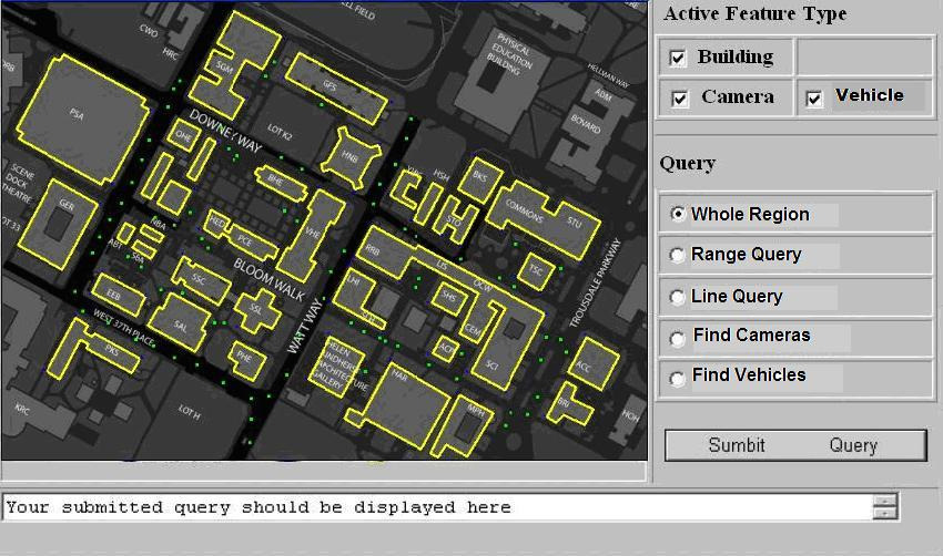 Then there would be a panel showing the USC map and several query options, such as whole region, range query, line query, find cameras and find vehicle.
